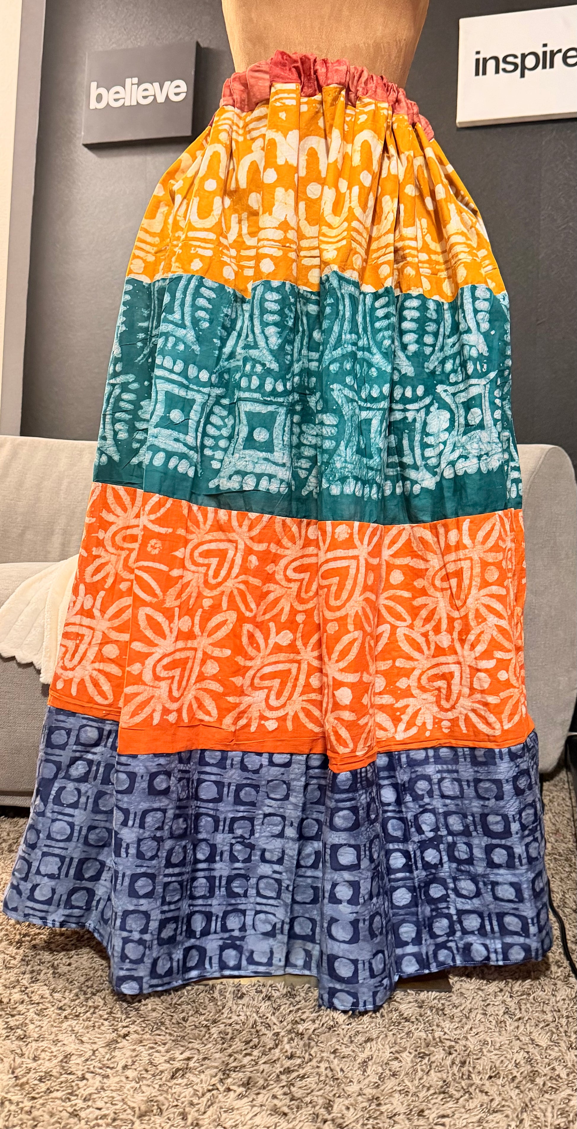 Adire mismatch skirt, Caribbean Inspired Design, flowing silhouette, fits S to Size 18