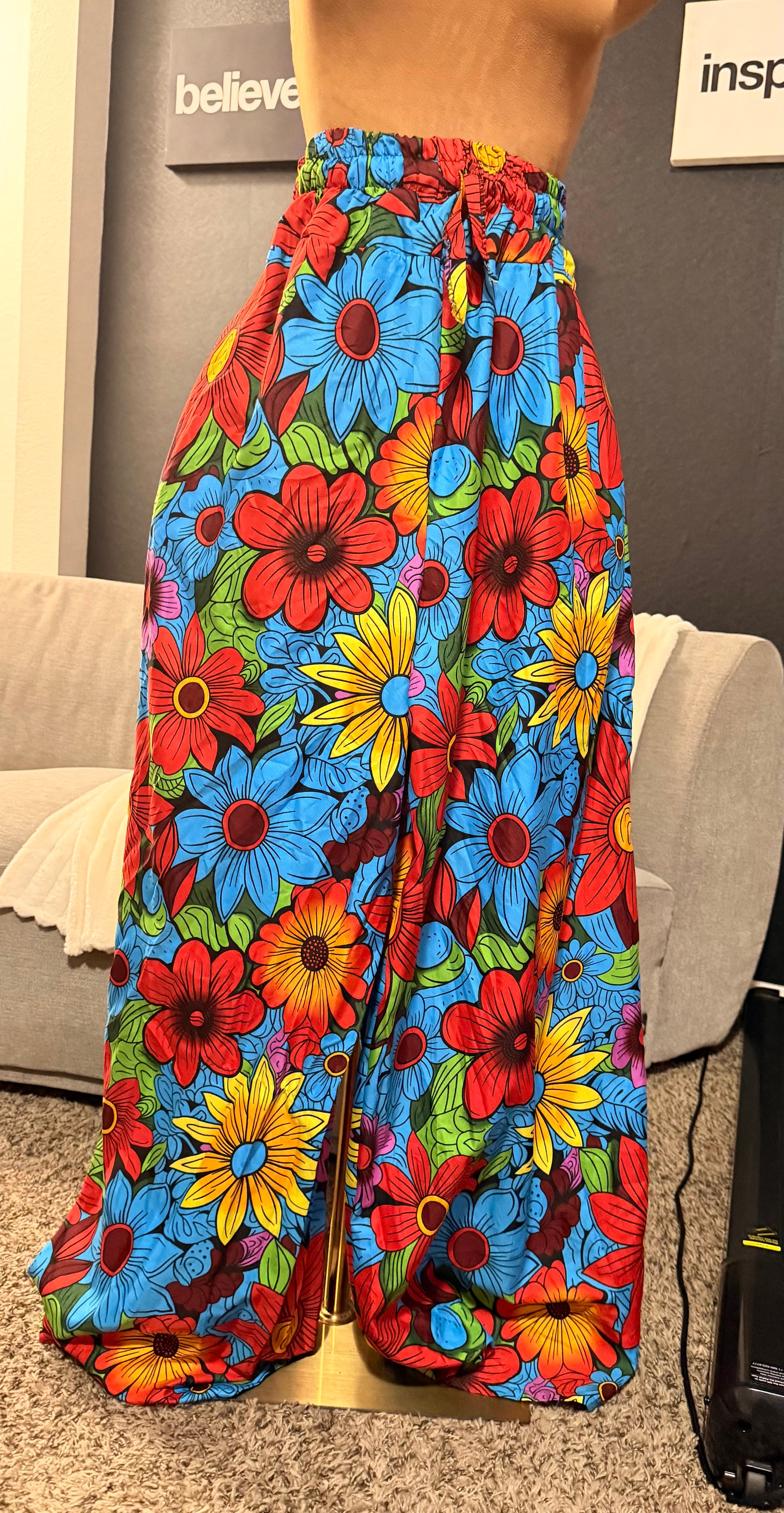 Elevate your wardrobe with this striking flower Ankara pant, crafted from vibrant, authentic Ankara fabric that commands attention. The relaxed long silhouette offers all-day comfort, while the elastic waist with adjustable rope drawstring ensures a customized fit for any body type. Practical side pockets provide functional storage without compromising style. Perfect for casual outings, cultural events, or making a bold fashion statement, this piece seamlessly blends traditional African aesthetics with contemporary comfort.