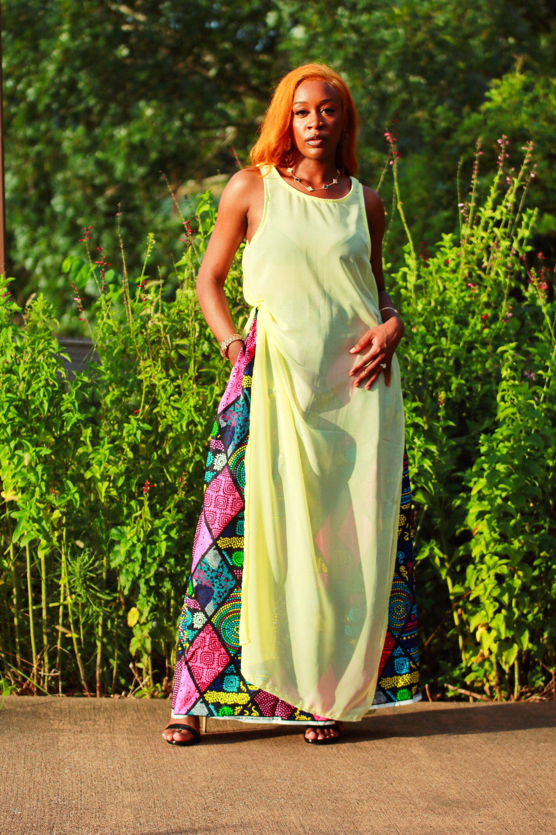 The JADE Set is a breath of fresh air — a graceful fusion of bold African prints and soft modern charm. Featuring multicolored Ankara pants bursting with life and a sheer dust-yellow top that flows with every step, this set is crafted for the woman who moves in both strength and softness.